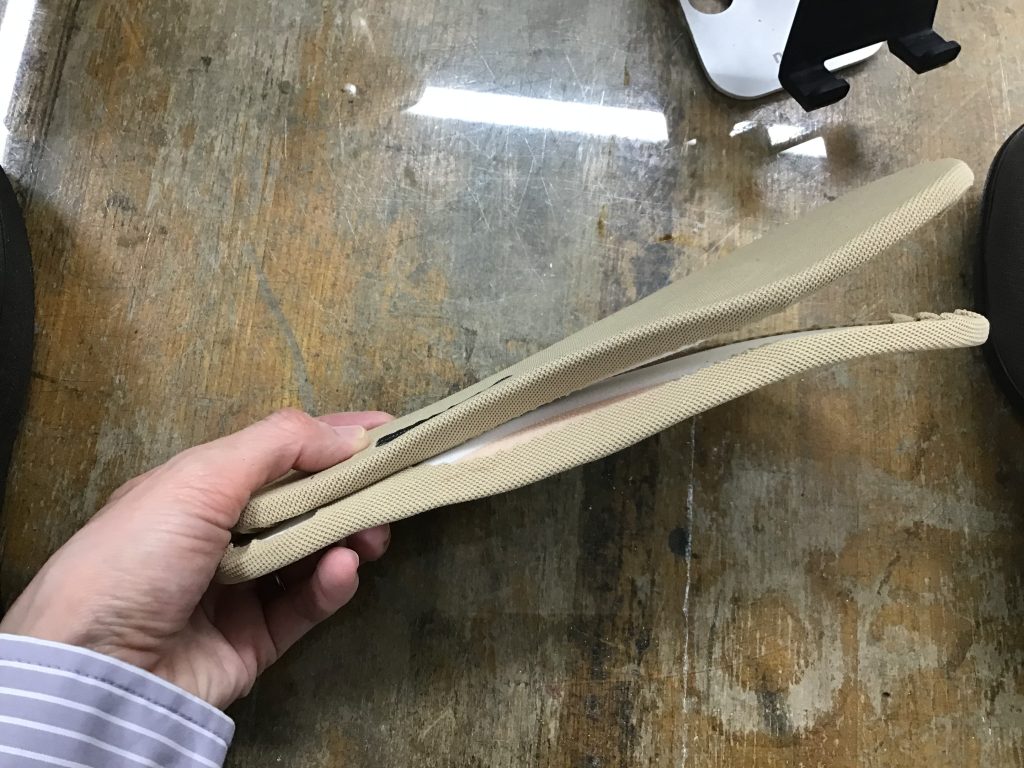 足の甲が高く足裏に痛みが出る凹足変形という症状でみえられました。仮合わせ時にはこちらが予想していた以上にさらに甲を高くとのご希望があり、その方が調子が良いと言われたので、そのように対応しました。今では快適に通勤されているそうです。