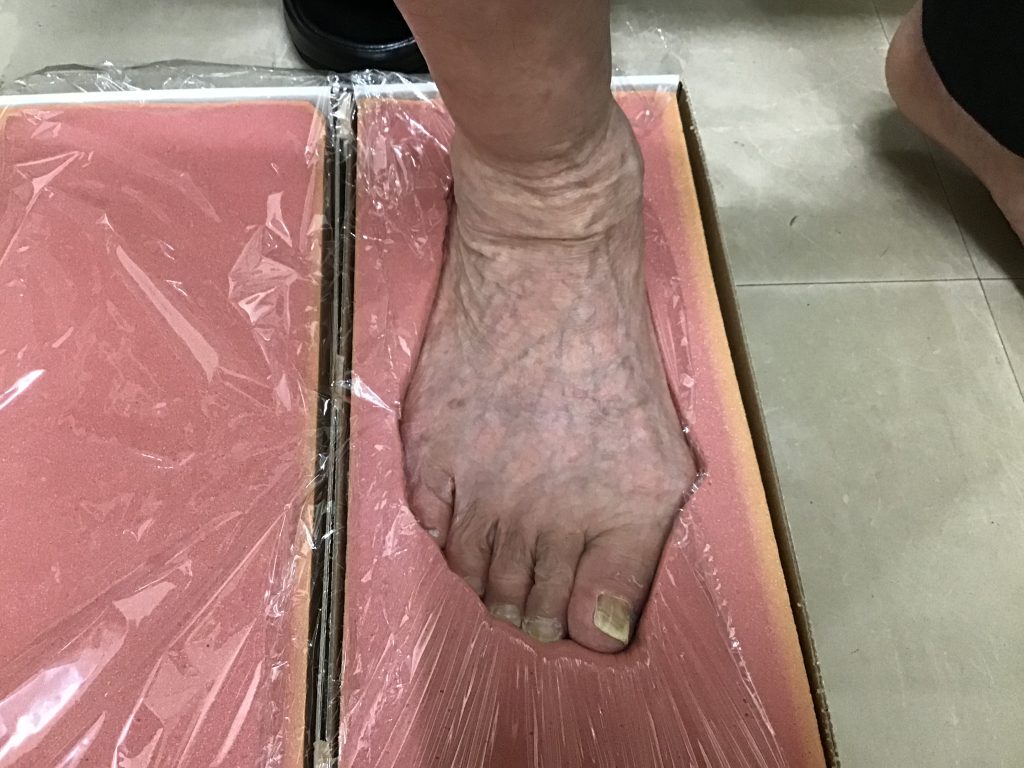 ポリオの症状がある方でつえを使用し歩かれていますが、足首がななめに下がり歩行には苦労されています。今までも靴は作られていたそうですが、靴が骨に触れて痛いということです。