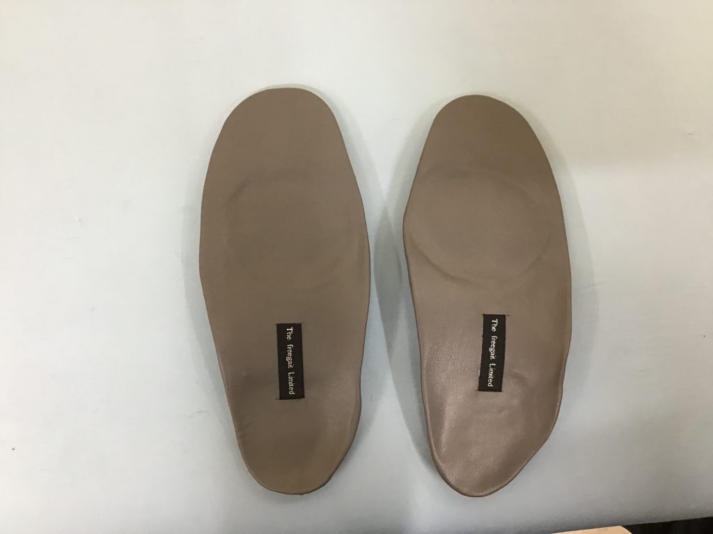 ご自宅で華道教室をされていて生徒さんに教えておられています。変形性股関節症のため左右の足の長さが違っています。家にいる時間が長いため、室内履きを希望されました。既成のスリッパをお持ちいただき、脚長差や足の変形を補うように左右の高さを合わせ、すべり止めに本革を巻き一針一針ずつ縫って加工し、見栄えよく加工しました。外から見ても加工がわからないような室内履きを提供でき、気持ちが明るくなったとおっしゃっていただけました。