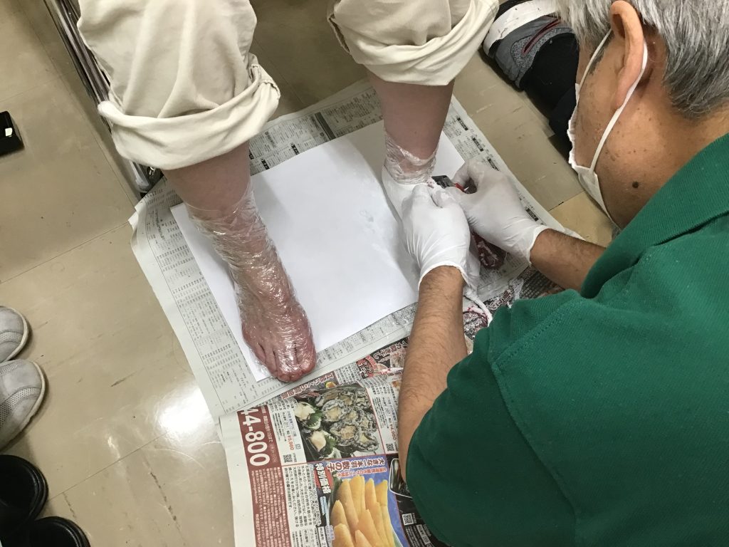お一人お一人、足裏の型をお採りします。お持ちの靴の形状に合わせてお作りします。普段履かれている靴をお持ちください。